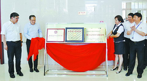 图为我行股东王仁果先生和我行员工马少彬、张洪阁、王强同志共同为“全国五一劳动奖状”“全国三八红旗集体”“博士后创新实践基地”揭牌。 韩 航摄